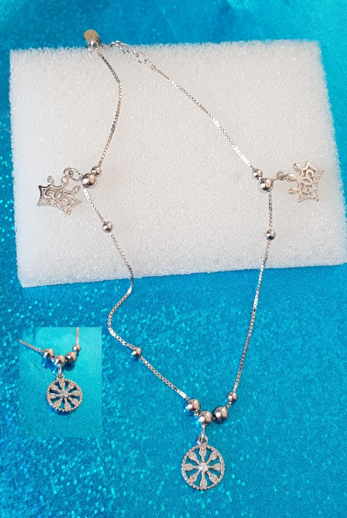 Entdecken Sie unsere wunderschöne 925 Silberfußkette, die mit zwei bezaubernden Kronen und einem funkelnden Kreis verziert ist:
