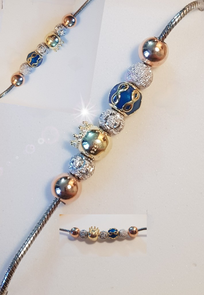 Dieses bezaubernde Armband präsentiert in der Mitte sieben wunderschön gestaltete Schmuckkugeln, von denen zwei an ein königliches Paar erinnern und dem Armband einen ganz besonderen Hingucker verleihen.