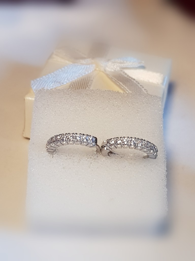 Diese wunderschönen Creolen präsentieren sich mit einer Reihe von weißen, leuchtenden Zirkonia-Steinen, die die Creolen zum Strahlen bringen und ihnen einen Hauch von Luxus verleihen. Das dezente Muster entlang des äußeren Randes verleiht den Creolen eine zusätzliche Raffinesse und Eleganz.