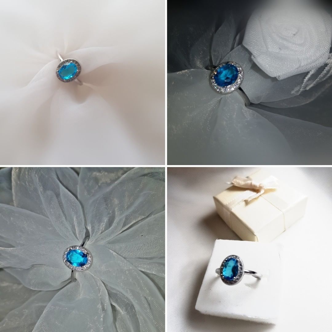 Dieser atemberaubende Ring präsentiert einen hochwertigen ovalen Schmuckstein, der in seiner Brillanz an den leuchtenden Ozean erinnert. Der Schmuckstein ist von glitzernden Steinen umschlossen, die seinen Glanz verstärken und seine Schönheit unterstreichen.