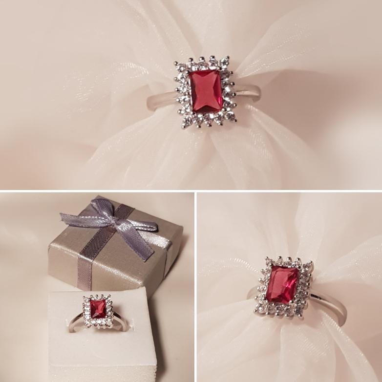 Dieser bezaubernde Ring präsentiert einen roten Schmuckstein in Diamantenoptik, umgeben von funkelnden weißen Steinchen, die ihm ein königliches Aussehen verleihen und seine Schönheit unterstreichen. Der hochwertig verarbeitete rote Schmuckstein in Diamantenform ist von kleinen, rechteckigen Schmucksteinen umgeben, die ihm einen raffinierten und edlen Rahmen verleihen.