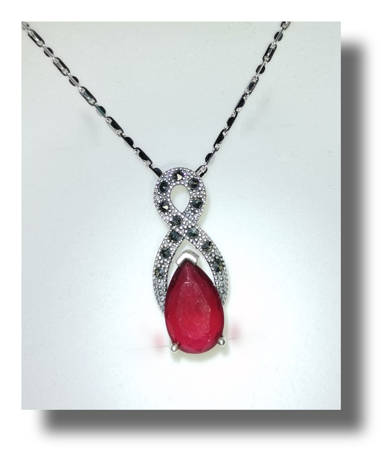 Entdecken Sie unseren wunderschönen 925 Silberanhänger mit einem roten, hochwertigen Schmuckstein als Highlight in einer Infinity-Fassung: