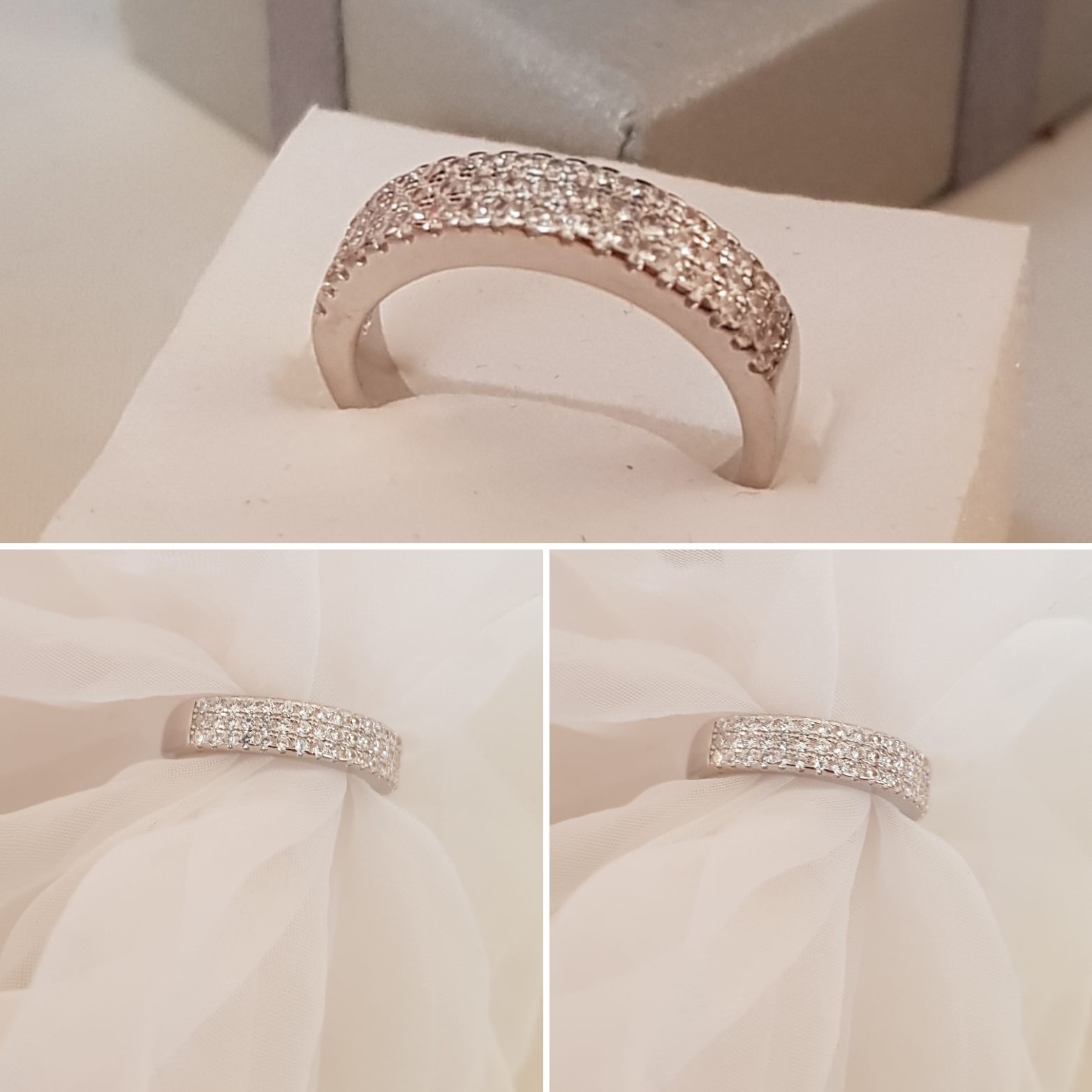 Dieser zauberhafte Damenring in Größe 51 präsentiert sich mit drei Reihen wunderschöner weißer Glitzersteinchen, die sich zu einem Viertel um den Ring legen und ihm ein zeitloses und elegantes Aussehen verleihen.